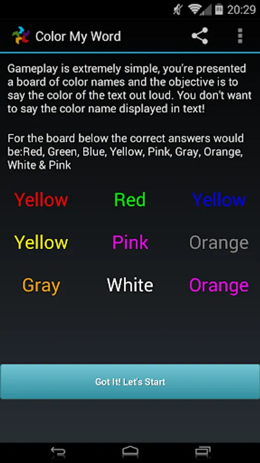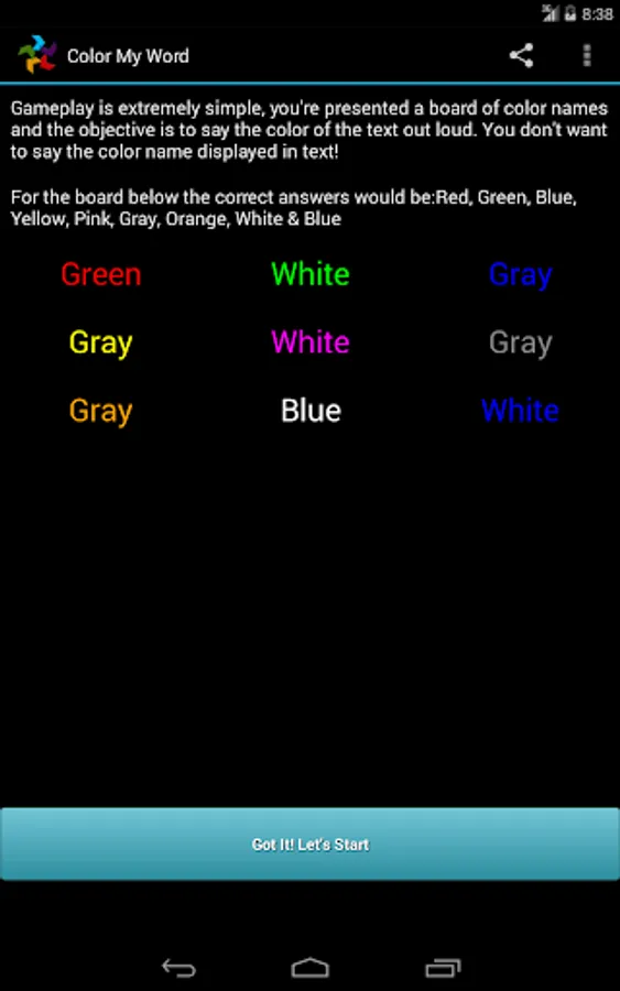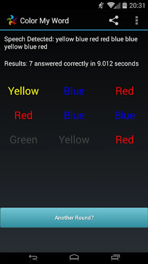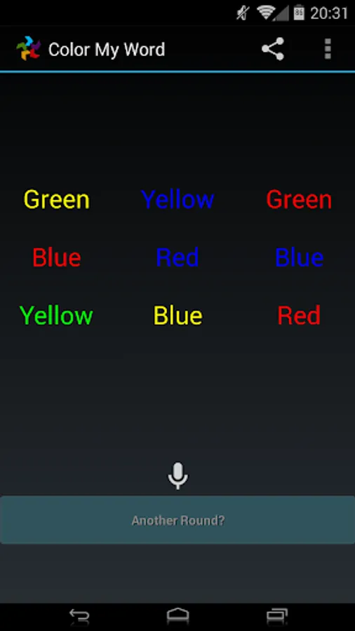 Color My Word is a simple brain teaser which you are given a board full of color names but the color of the text may not match the color name displayed. The objective is to say the color of the text for the whole board as quick as possible.