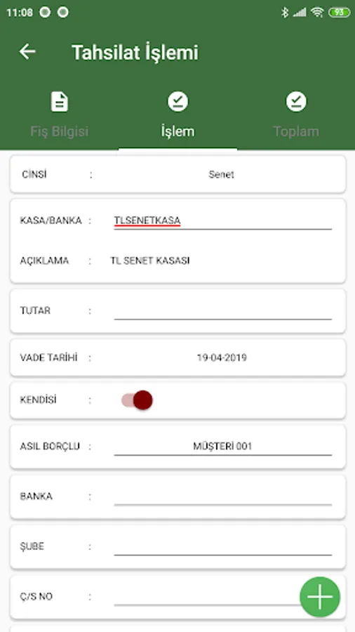 Cash, check, note and credit card types can be entered. During check collection, check number, debtor information and bank information can be entered.