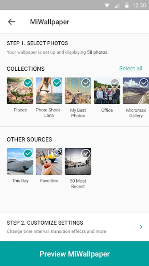 - Easy select (by swiping left/right/diagonally) photos to Add to Collection, MiWallpaper, Favorites or Delete