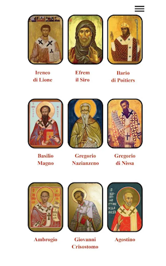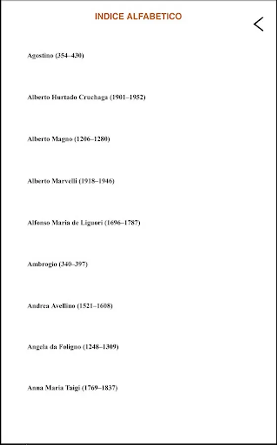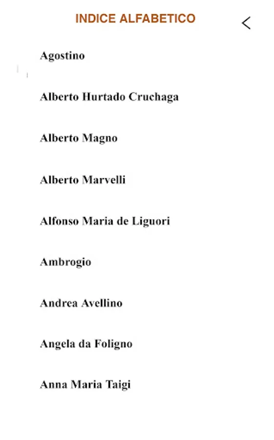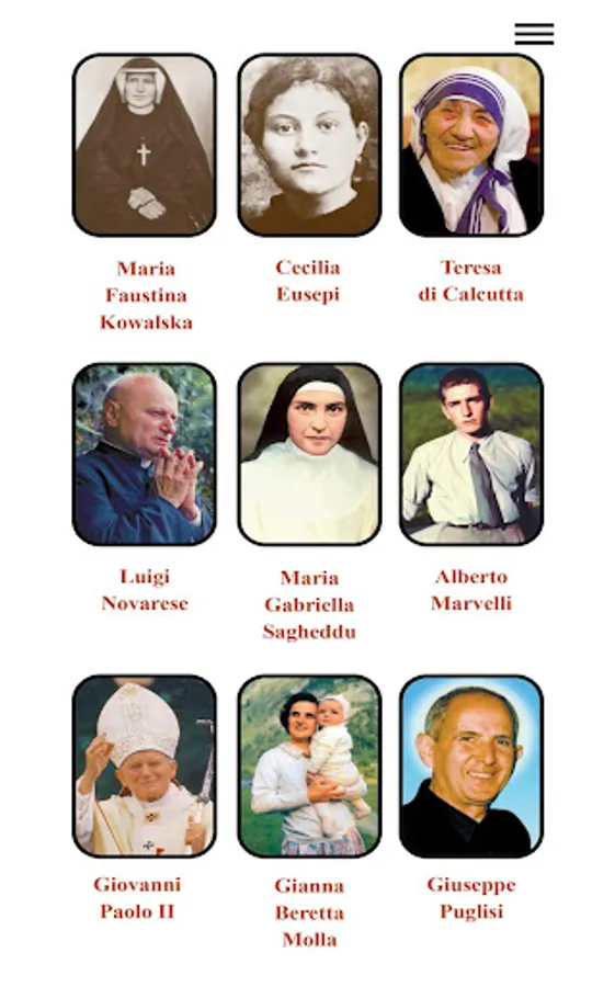 Index of saints: Augustine, Alberto Hurtado Cruchaga, Alberto Magno, Alberto Marvelli, Alfonso Maria de Liguori, Ambrose, Andrea Avellino, Angela of Foligno, Anna Maria Taigi, Annibale Maria Di Francia, Anselm of Canterbury, Anthony of Padua, Bartolo Longo , Bartolomea Capitanio, Basil the Great, Benedict of Norcia, Bernardine of Siena, Bernard of Clairvaux, Bonaventure, Camilla Battista da Varano, Camillo de Lellis, Carlo Borromeo, Catherine of Siena, Cecilia Eusepi, Charles de Foucauld, Cyril of Alexandria , Claude de la Colombiere, Claudio Granzotto, Clelia Barbieri, Colombano, Contardo Ferrini, the Cure of Ars, Damien de Veuster, Ephrem the Syrian, Elena Guerra, Elizabeth of the Holy Trinity (Elisabeth Catez), Herman the cripple, Frederic Ozanam, Francesca Xavier Cabrini, Francis of Assisi, Francis of Paola, Francis de Sales, Francis Pianzola, Francesco Saverio, Francesco Spinelli, Gaspar Del Bufalo, Gertrude the Great, Gemma Galgani, Germanus of Paris, Giacomo Alberione, James of the Marches, Gianna Beretta Molla , Jane Frances de Chantal, John Bosco, John Chrysostom, John Damascene, John of the Cross, John Eudes, Giovanni Leonardi, John Paul II, John XXIII, Jerome Emiliani, Giulia Salzano, Joseph of Cupertino, Giuseppe Marello, Giuseppe Moscati, Giuseppe Puglisi Justin Maria SS. Trinity, Gregory of Nyssa, Gregory Nazianzen, Guido Maria Conforti, Ignatius of Loyola, Hilary of Poitiers, Innocent of Berzo, Irenaeus of Lyon, Isidore of Seville, Jacopo (Iacopone) from Todi, John Henry Newman, Laura Vicuna, Ludovico da Casoria Luigi Giussani, Luigi Guanella, Louis Marie de Montfort, Luigi Monza, Luigi Novarese, Luigi Orione, Hope Mother of Jesus, Marco d'Aviano, Margaret Mary Alacoque, Maria Bertilla Boscardin, Maria Candida of the Eucharist, Mary Crucified Curcio, Mary Crucified Rose, Maria de Mattias, Mary of the Angels (Marianna Fontanella), Mary of Jesus Crucified (Mariam Baouardy), Henrietta Maria Dominici, Faustina Kowalska, Maria Gabriella Sagheddu [or Unit], Maximilian Maria Kolbe, Nicolas Barré , Paul VI (Giovanni Battista Montini), Patrick, Peter Damian, Peter Canisius, Peter of Alcantara, Peter the Venerable, Pio of Pietrelcina, Pius IX, Pius X, Richard Pampuri, Symeon the New Theologian, Teresa Benedicta of the Cross (Edith Stein), Teresa, Teresa of Jesus (of Avila), Therese of Lisieux, Teresa of Jesus of the Andes, Teresa Eustochio Verzeri, Timothy Giaccardo, Thomas Aquinas, Thomas More, Humble Bisignano, Venancio Fortunato, Veronica Giuliani, Vincent Strambi, Vladimir Ghika, Zelia Guerin.