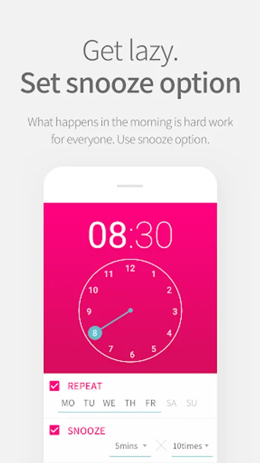 If you want to sleep a little more, just tap snooze! We have various snooze options you can set. When you are tired, you can wake up a little later. Wouldn't it be a great day after enough sleep?