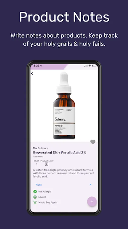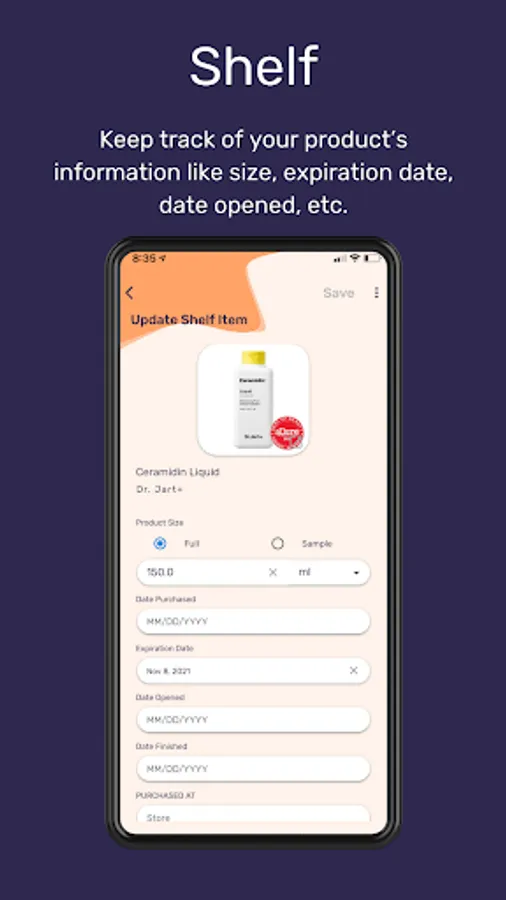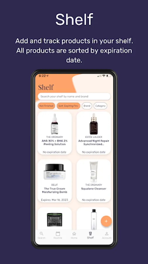 Shelf: Products in your shelf are automatically sorted by expiration date. Add products from our database. Track information about your products like expiration date, purchase date, date opened, size, purchase location, and date finished.