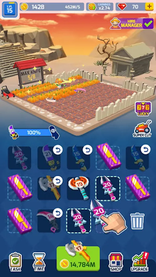 The grass is growing rampant in the neighborhood! Can you merge knives, axes and grass cutters to clean up the lawn fast enough? Mow down the overgrown grass now!