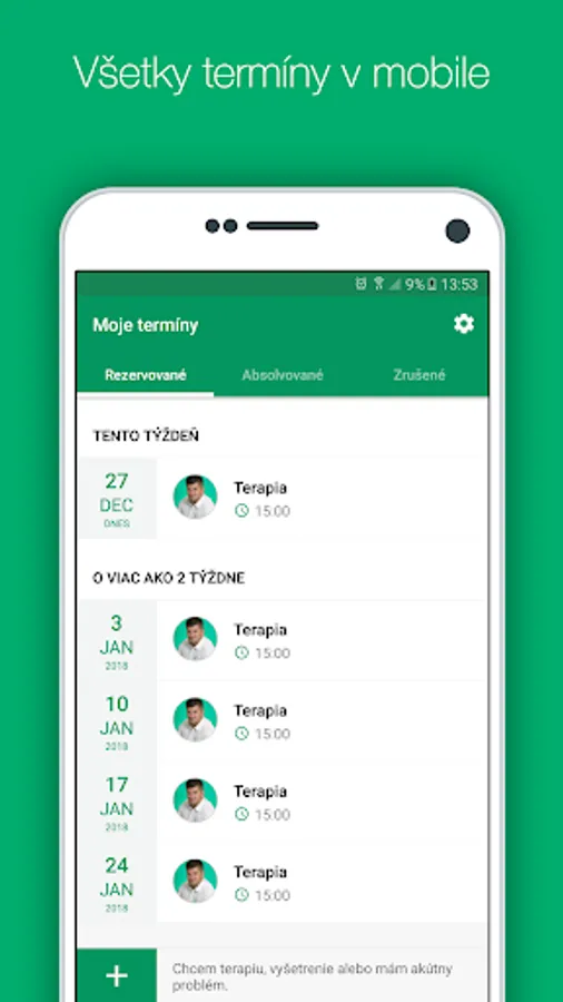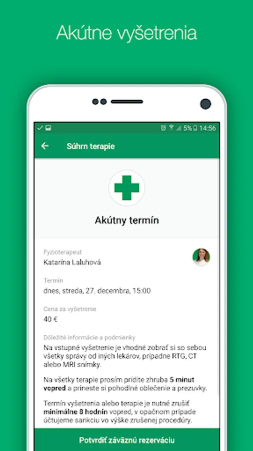 The application is designed for clients FYZIO clinic for quick and easy ordering deadlines. Clients can be ordered on most services. Through the application you can be ordered to investigate difference kinds of diagnostics and therapy. If the shear or other sudden pain can be acute Rezer the term. When choosing the date the client can choose the therapist and length of therapy. In addition to booking dates and can interfere. Client you find in one place all of your incoming, completed and canceled dates. The application offers the possibility statements on dates via push notifications and also the insertion of the term to the calendar directly on your phone.