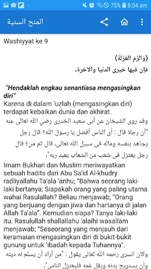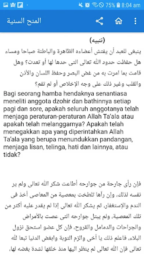 al-Minah as-Saniyyah is a work written by Shaykh Sayyid ‘Abd al-Wahhab asy-Sya'rani as a commentary on Sheikh Abu Ishaq Ibrahim's al-Matbuliy in the book Qomi’ ath-Thughyaan. This book discusses the things that must be done a salik (spiritual path walker) in undergoing the tariqa. The style of language used is quite simple and easy to understand for beginners and spiritual practitioners who are new to the tarekat. The communicative impression is very much felt, as if the writer spoke directly and faced with the reader. So that the language displayed uses many command sentences or direct prohibit sentences.