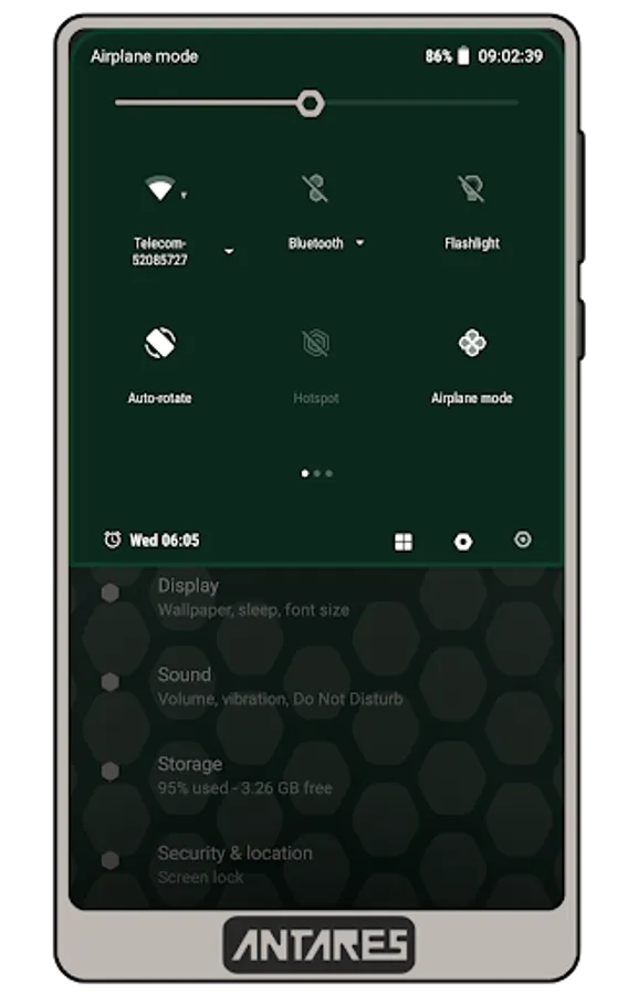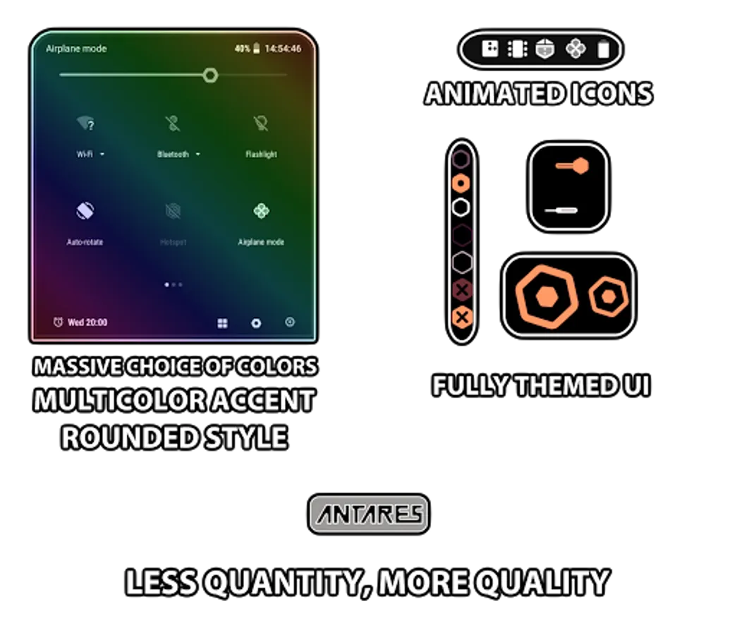 * to use this feature (the ipg theme), download Icon Pack Generator app from Play Store (it's free! https://goo.gl/gl3Y6J), and click on "themes" thanks to Antares you can set a custom hexagonal icon pack instantly!