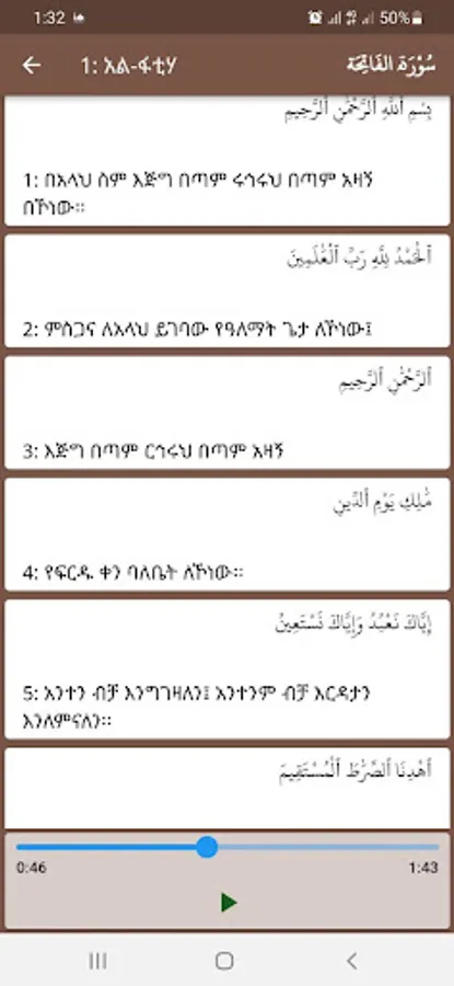 የድምፅ ሥራው ሙሉ በሙሉ ተጠናቆ በቅርቡ በዚህ መተግበሪያ እስኪጫን ድረስ፤ ለጊዜው ሱረት አል ፋቲሃን ጨምሮ ከሱረቱ አን ናስ እስከ ሱረቱ አን ነበእ (አንድ ጁዝ) የትርጉም ድምፅ ሥራው ያለክፍያ ቀርቧል።