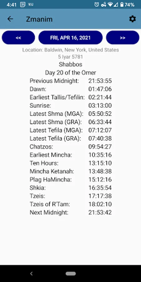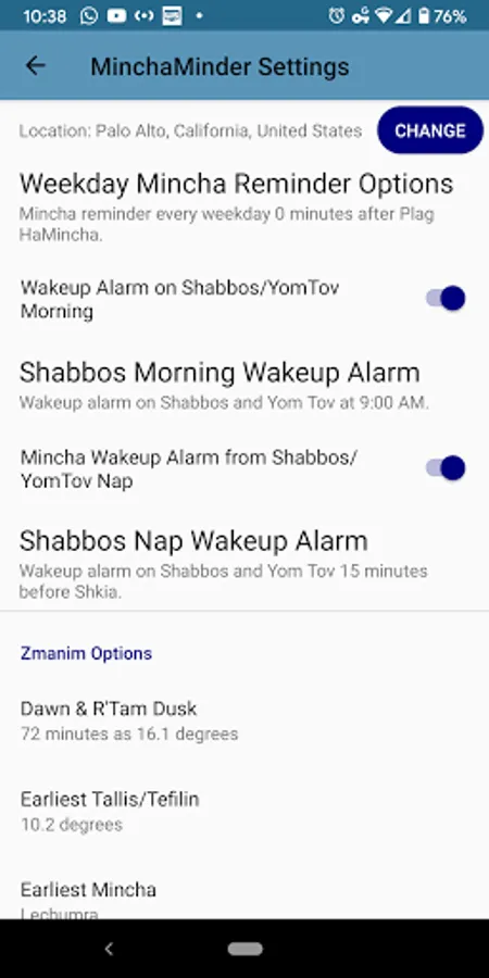MinchaManager always knows where you are, even when the app is closed or not in use, so it can calculate and display zmanim appropriate for sunrise/sunset at your exact location. Configure your zmanim shita per your minhag.