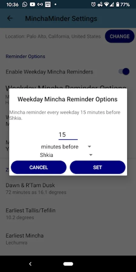 Set it for a specified number of minutes before shkia to remind you to go to shul or daven b'yechidus. Set it for Mincha Gedolah to daven at the earliest time, or set it for Mincha Ketana to daven at an ideal time.