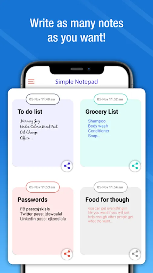 Notepad with sticky notes to organize your thoughts on notebook of this note taking app. Write notes using notepad of the “Simple Notepad – Color Note”