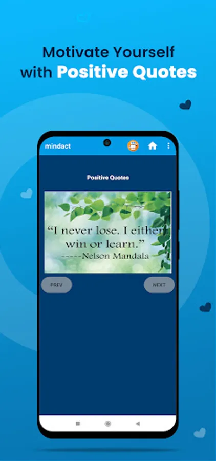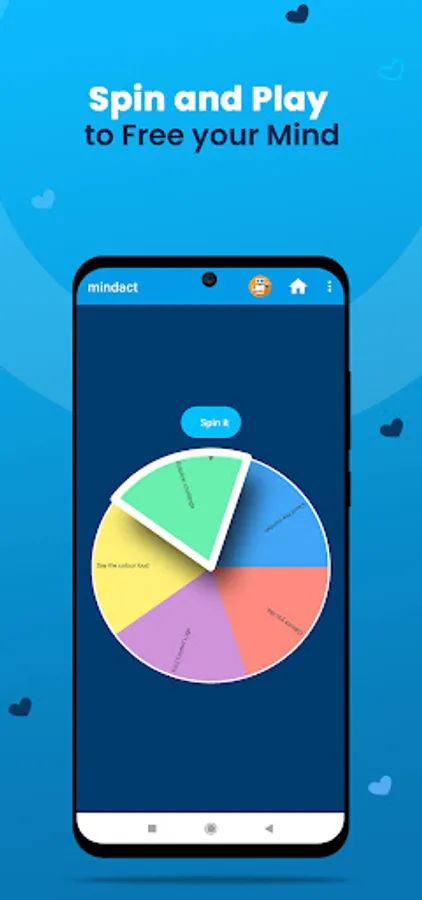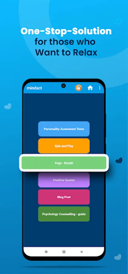 Mindact provides stress-busting games by spinning wheels. The games are refreshed on a regular basis without the need to update the app. Through a link to the website www.mindact.in, the application provides access to their blogs about mental health. The application has positive quotes which to are refreshed regularly. This makes sure that one need not have to update the app frequently.