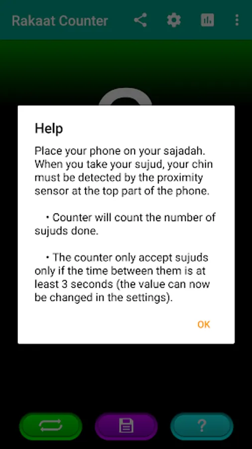 From time to time, many muslims forget the number of rakaats while performing solat. This app is intended to help counting the number of rakaats in solat. It uses proximity sensor to count the number of rakaats and sujuds that have been performed. The phone must be placed on the sajadah (praying mat) such that when we perform sujud, the phone's position is underneath the user's chin.
