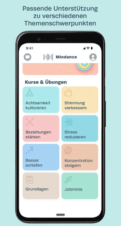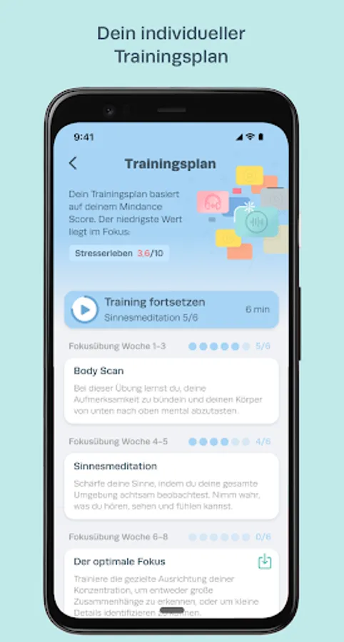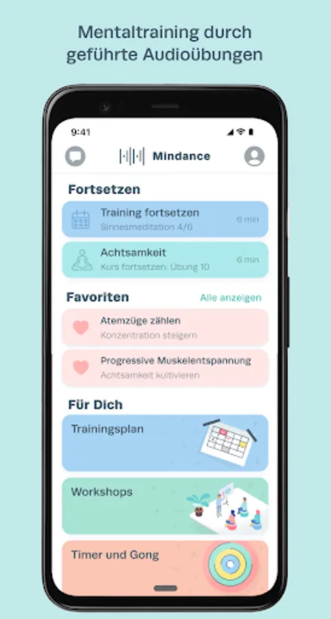 Mindance is your personal assistant for more well-being. Whether you feel stressed and want to relax, you just want to concentrate better, or you want to improve your relationship with yourself and others, your personal training plan addresses your individual needs. For this purpose, a variety of different guided meditations, relaxation exercises and psychological techniques are available to you. Whether you are a beginner or advanced, our speaker will guide you through the exercises and explain everything step by step.