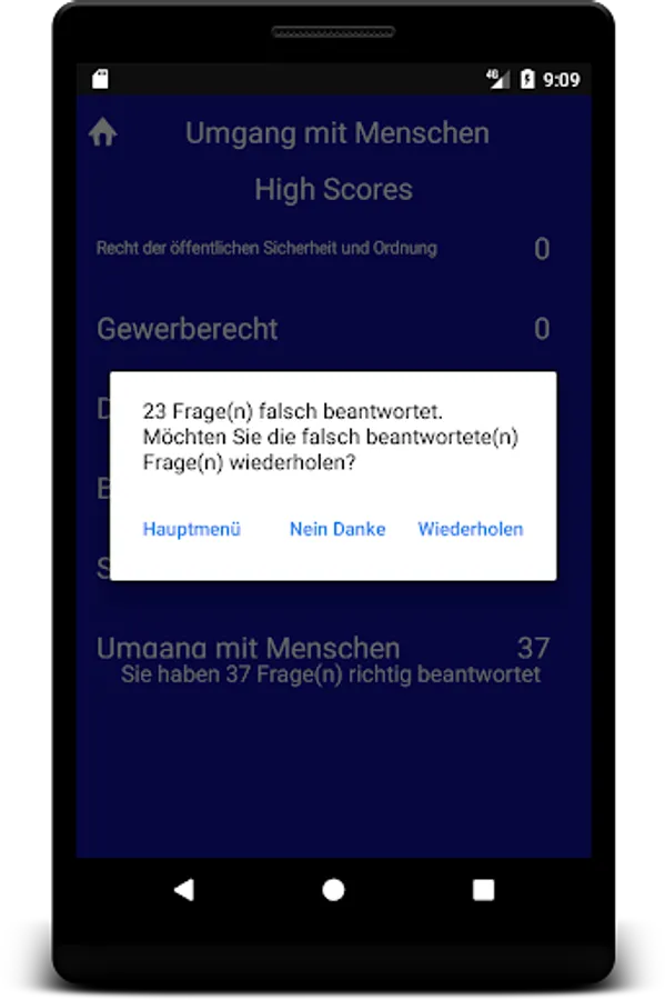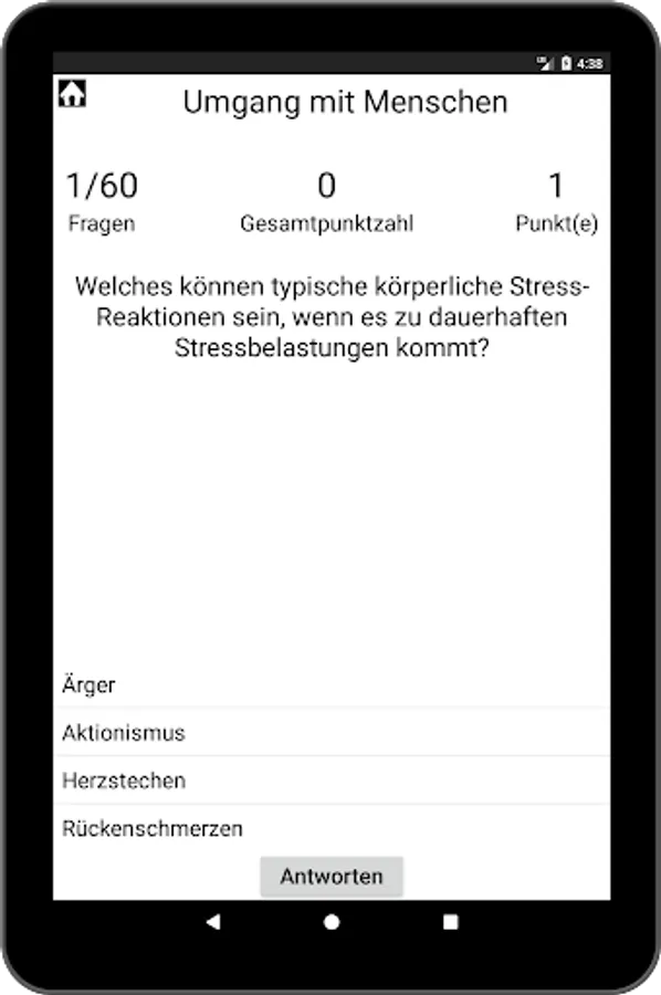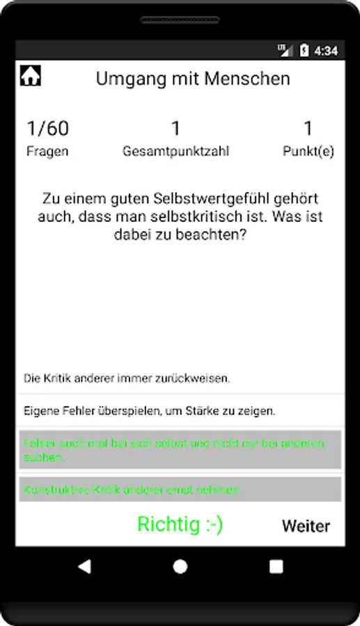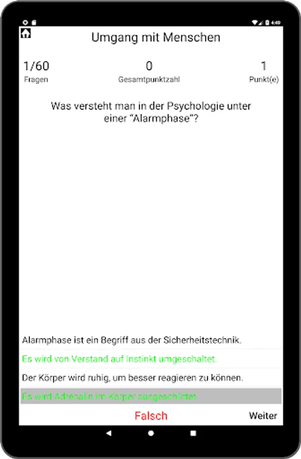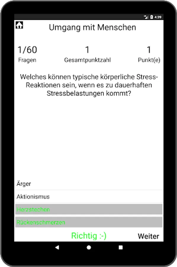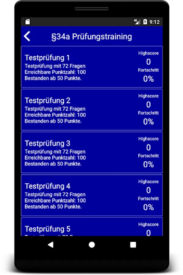 G. You can interrupt the catalog of questions or test exams at any time and continue later. !!! Before closing the app, click on the "house" in the top left, then the last status will be saved !!!
