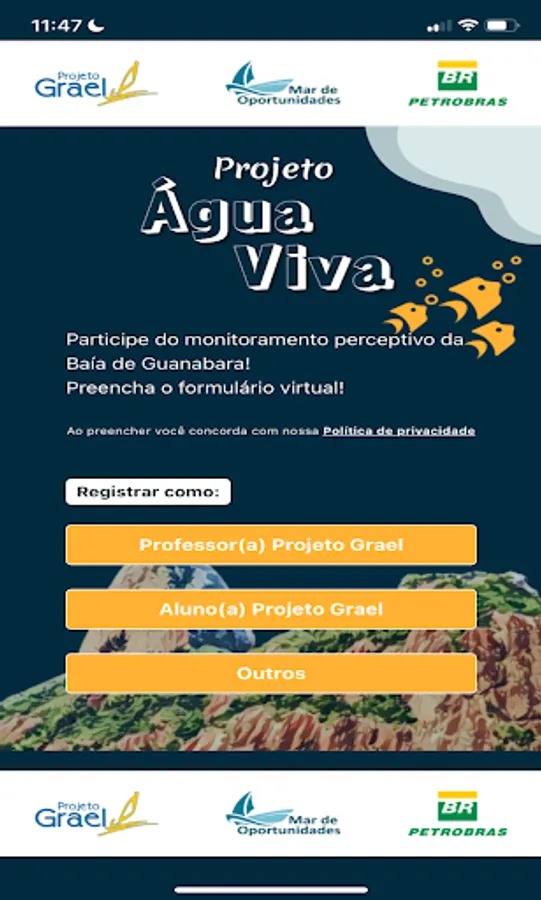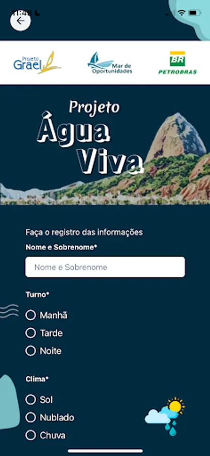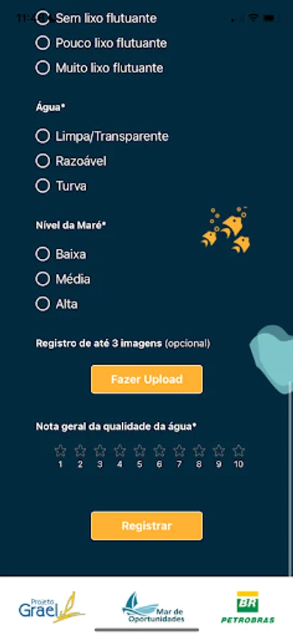 The Água Viva application promotes perceptive monitoring of the environmental conditions of Guanabara Bay. In it you can register: