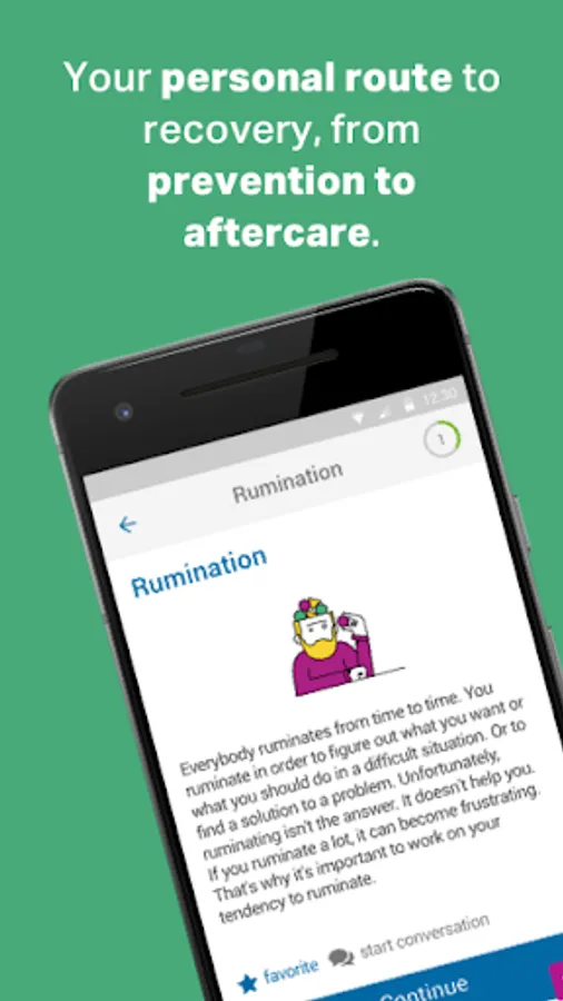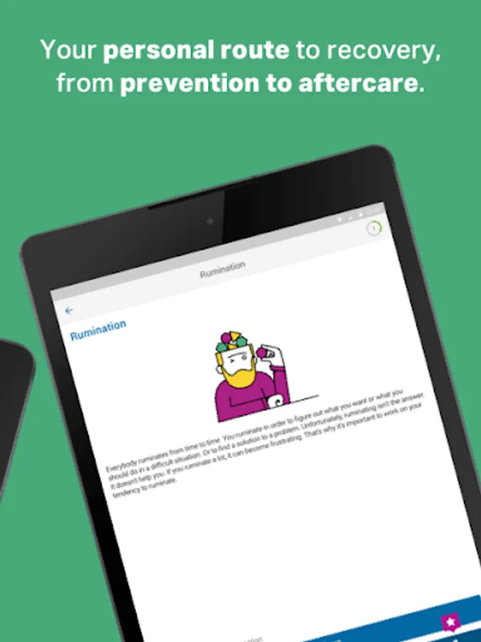 Together with your professional, you can compose a personal route to recovery. Select the module and elements that tie in exactly with your needs. The information, videos, exercises and examples will help you on your journey to recovery, step by step. You follow your route in the app and discuss it with your care provider.