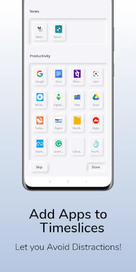 Timeslices are segments of your day that you set aside for usage of a group of apps. To break phone addiction, YourSlice helps you allocate a fixed period of time from your entire day to some apps. These apps can be used only within that Timeslice and are blocked for the rest of the day.