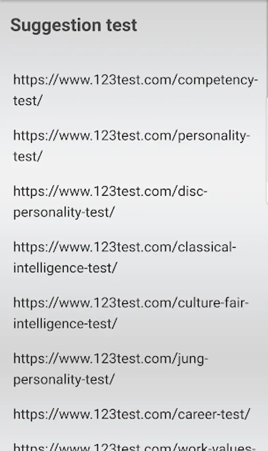 Apps ini mengumpulkan beberapa data untuk memudahkan pengguna melayari sesawang bagi mendapatkan 'Personality Test'.