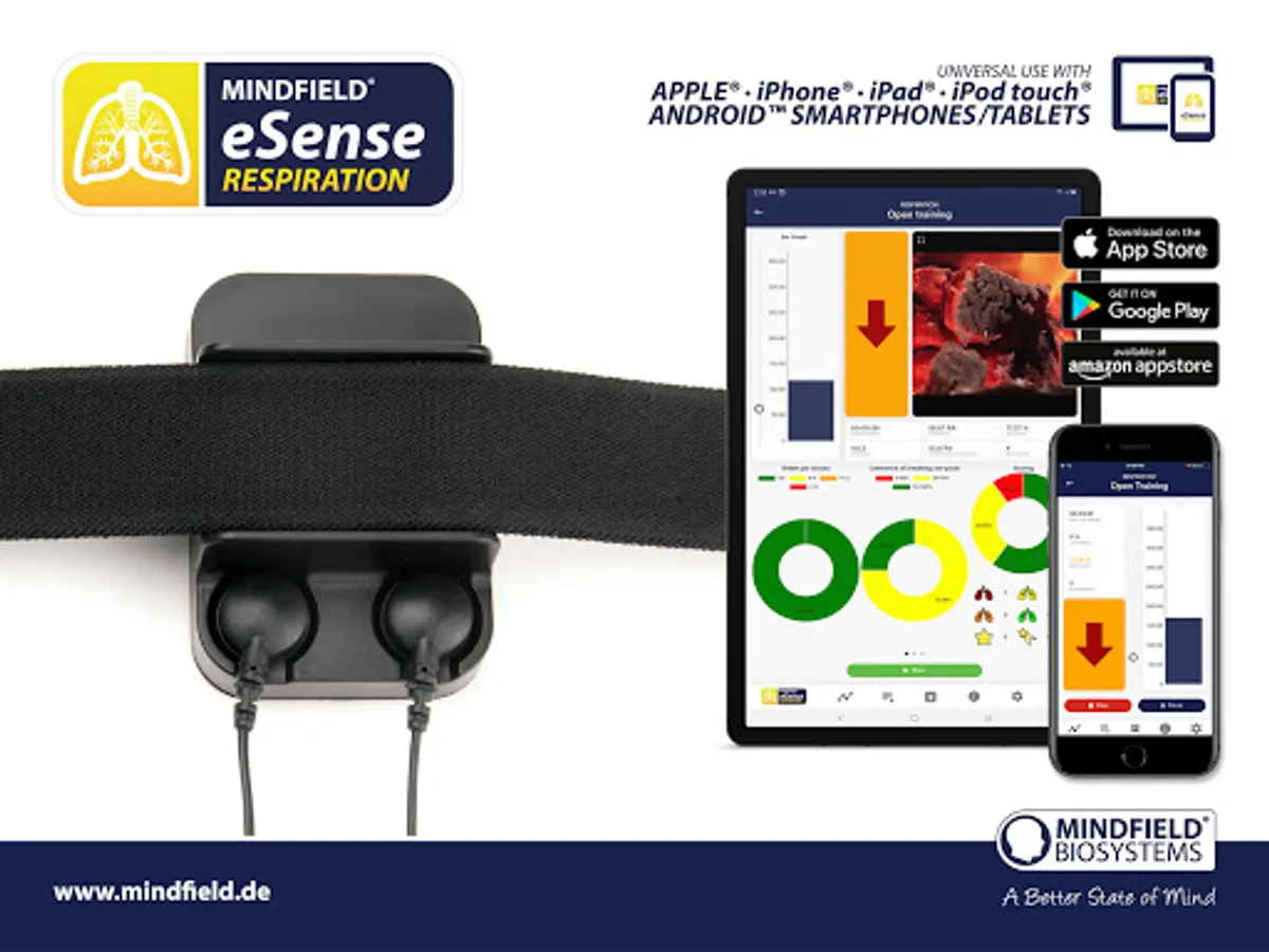 The new eSense Respiration sensor measures breathing amplitude and frequency with a pressure sensor and flexible belt and, optionally with eSense Pulse sensor, heart rate variability. It provides a unique and rich biofeedback experience on your smartphone or tablet to learn or regain a healthy breathing pattern.