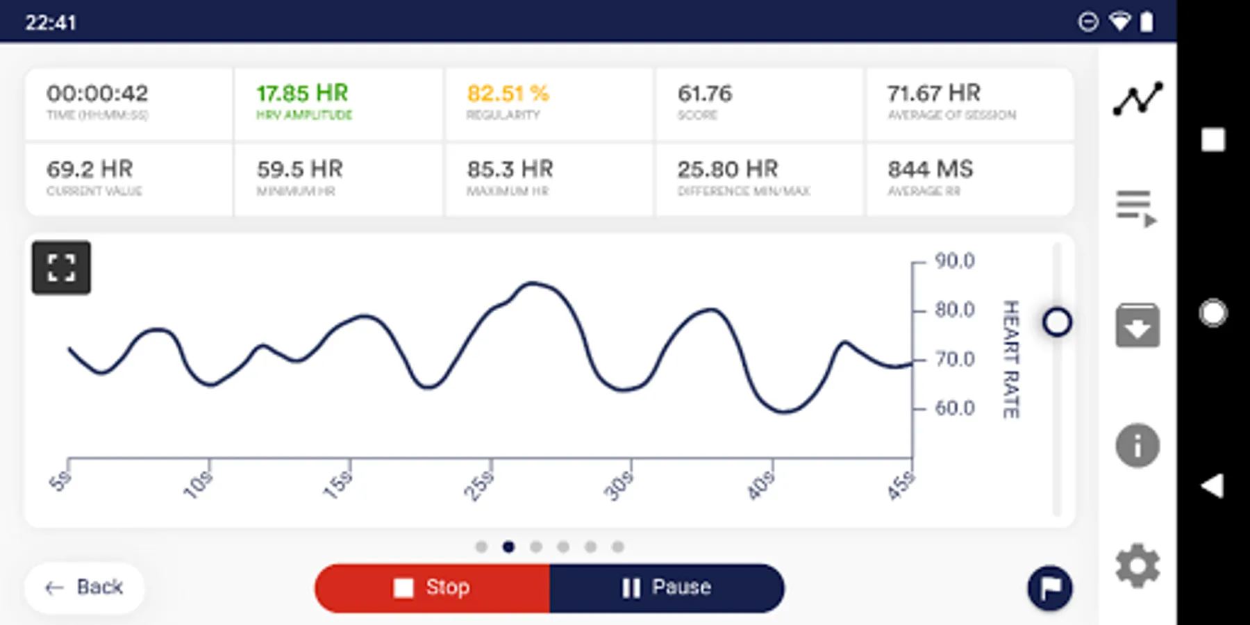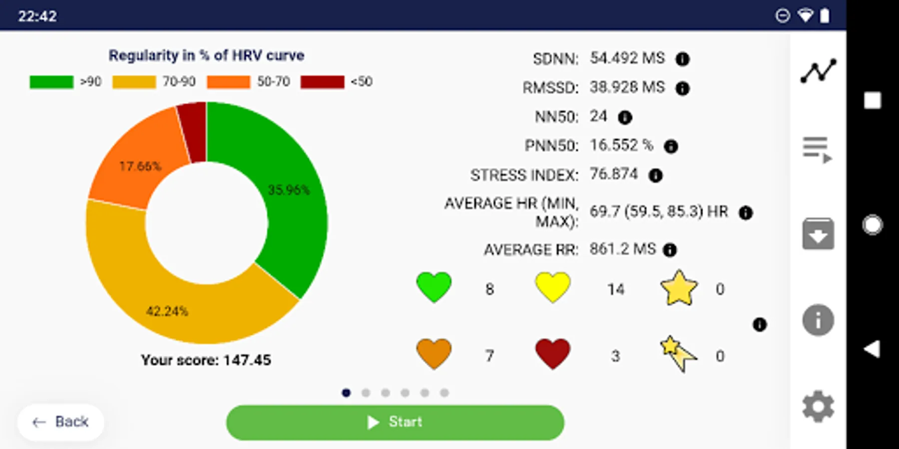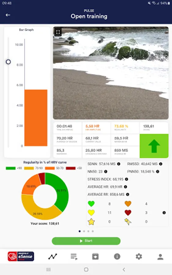 To describe the current state and progress of the training, the eSense app also provides essential statistics and analyses of HRV.