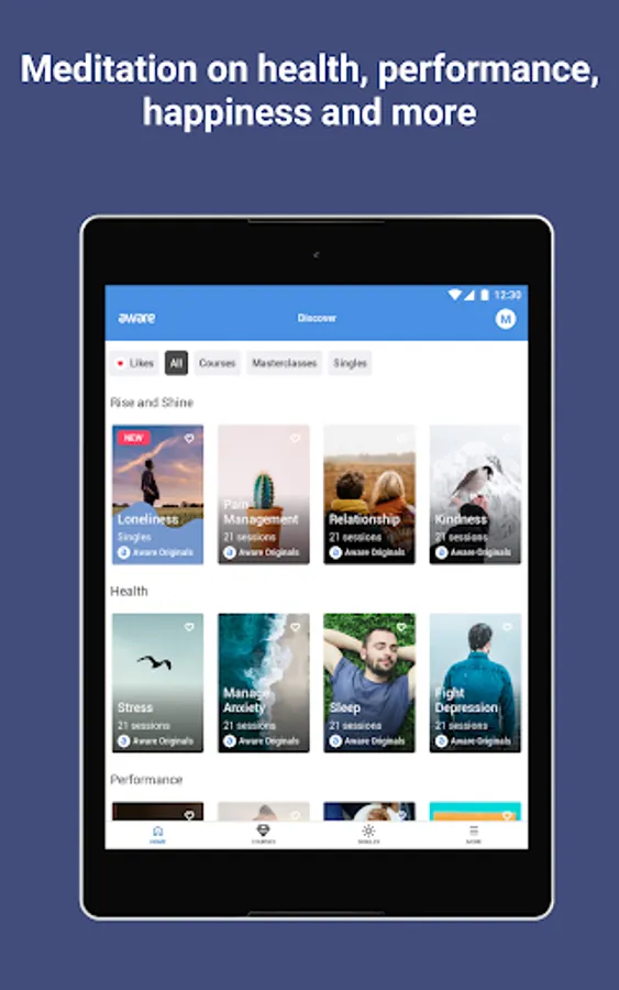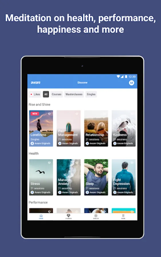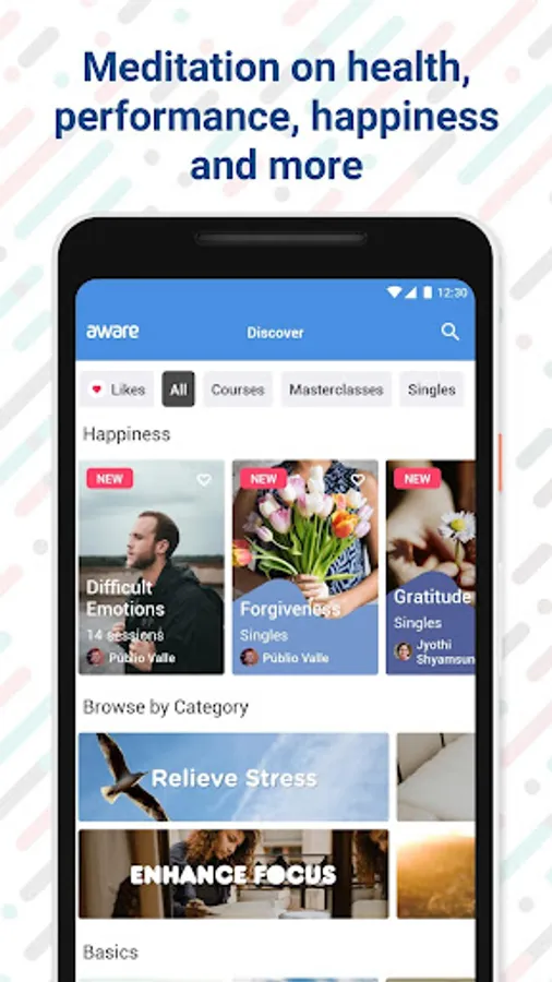 - Aware helps you meditate for different topics like stress, focus and happiness.