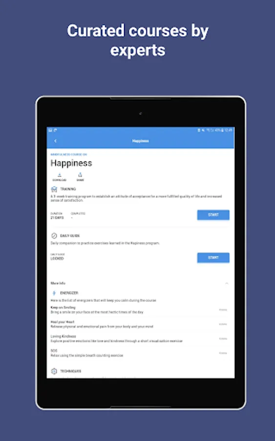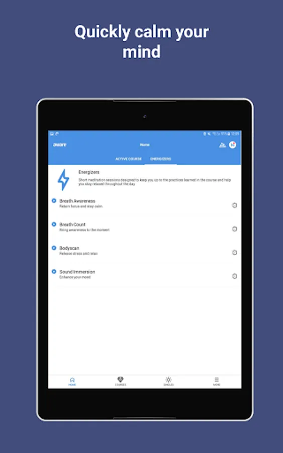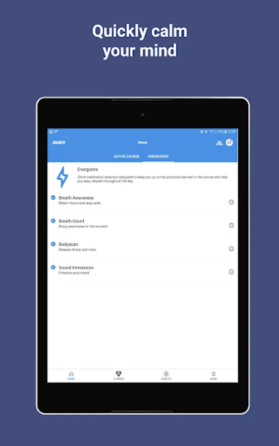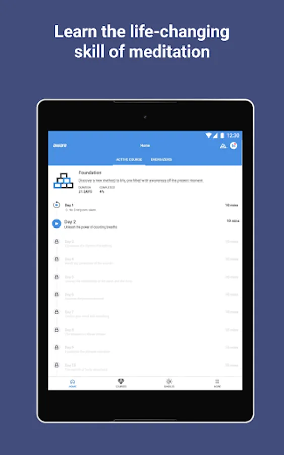 The Aware app teaches you the basics of mindfulness & meditation with the 21-day Foundation Course, of which, the first 7 days are for free. Once you complete the Foundation Course, the world of Aware unlocks various meditation courses on stress, anxiety, sleep, focus, happiness, depression, focus, creativity and many more. Each course is accompanied with short sessions called Energizers crafted to calm you at the stressful times of the day. Once you complete a course, Aware provides you daily guides to help you practice the exercises learned in the respective course.