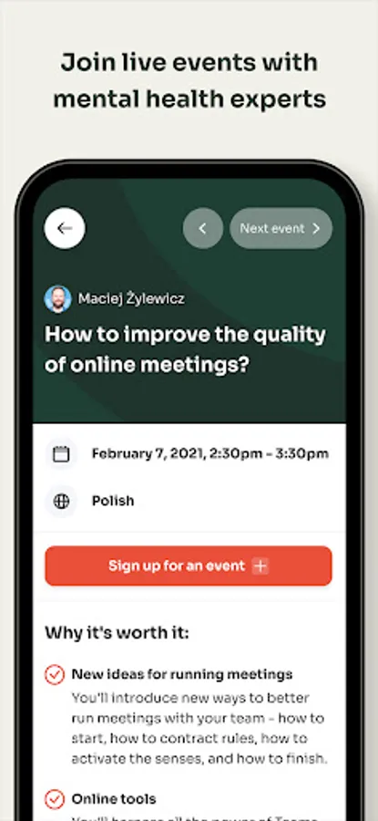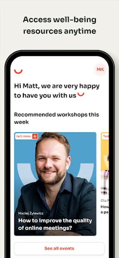+ Unlimited access to a mental health and well-being resource library (interactive events, mindfulness exercises, relaxation training, psychoeducational courses),