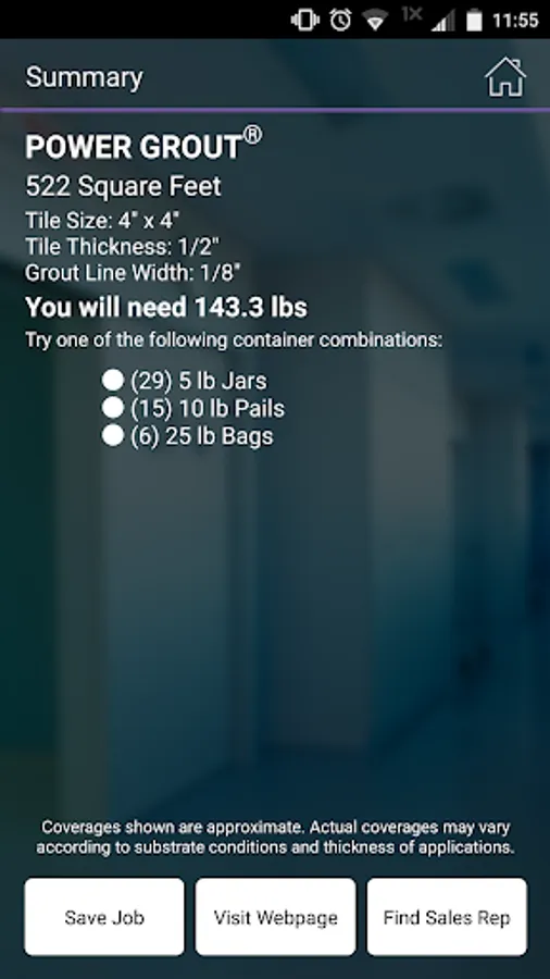 Calculate the estimated amount of surface preparation products, mortars and grouts necessary for a tile installation project. Enter your project’s specifications – including square footage, tile size and size of grout joint – and product estimates are reported in pounds and gallons and bags and pails. Save a product’s coverage summary to the “My Saved Jobs” section on the app. This feature allows you to store your projects and quickly reference them for future jobs.