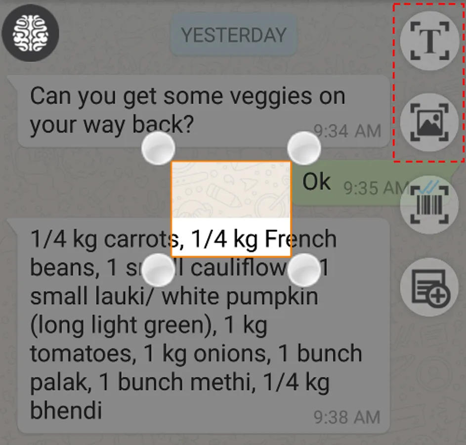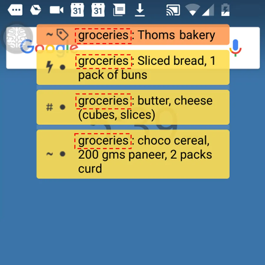 Notes can be tagged with text tags, images or barcodes which can be extracted from any app or via the phone camera. It works over any app to easily extract notes like from an sms, an email, a whatsapp or skype message.