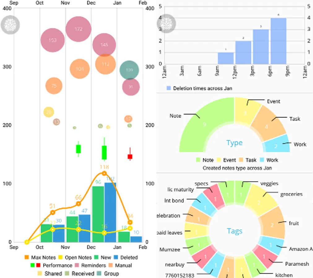 Top level and drill down analysis of reminders, actions and events. Track productivity trends across months and drill down to view hourly trends across the day, along with response time for various parameters.