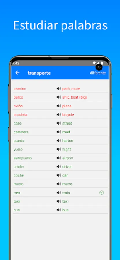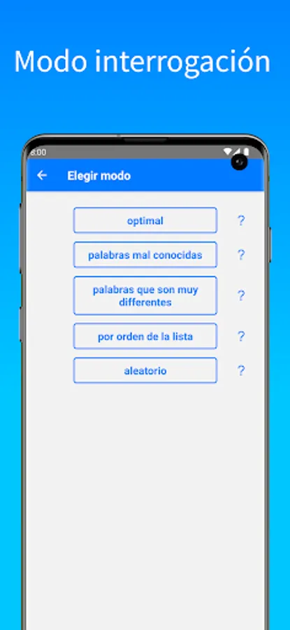 Later, when you practice again, the words you missed before will be interrogated more often, so your learning will be more effective. You can choose between several forms of interrogation: the 'optimal' interrogation will be to first interrogate the words one by one so that you learn them. Then it will focus mainly on the words you answered incorrectly. In 'random' mode the words will be interrogated randomly. 'List Order' will interrogate words in the order they appear in the list. Hard mode will interrogate only the words you have answered incorrectly before. Finally there is the 'different' mode, this mode is perfect for focusing on words that are very different in the language you want to learn compared to your own language.