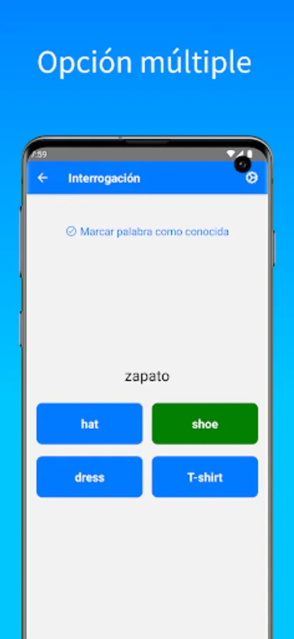 Each word list you can review and then train using 3 different ways: multiple choice, flashcard and write. When you've practiced the words, the ones you know well will appear in green and the ones you've missed will appear in red. So you can easily review the words that are difficult for you. You can also indicate words as known, these words will no longer appear in interrogations.