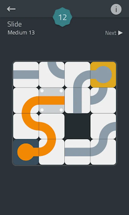 A classic slide puzzle. Shift and move the blocks and let the colors unroll through the path. Solve the level by connecting all the color sources with each other. The path also has to be a closed line.