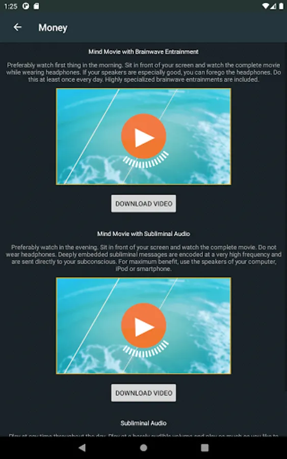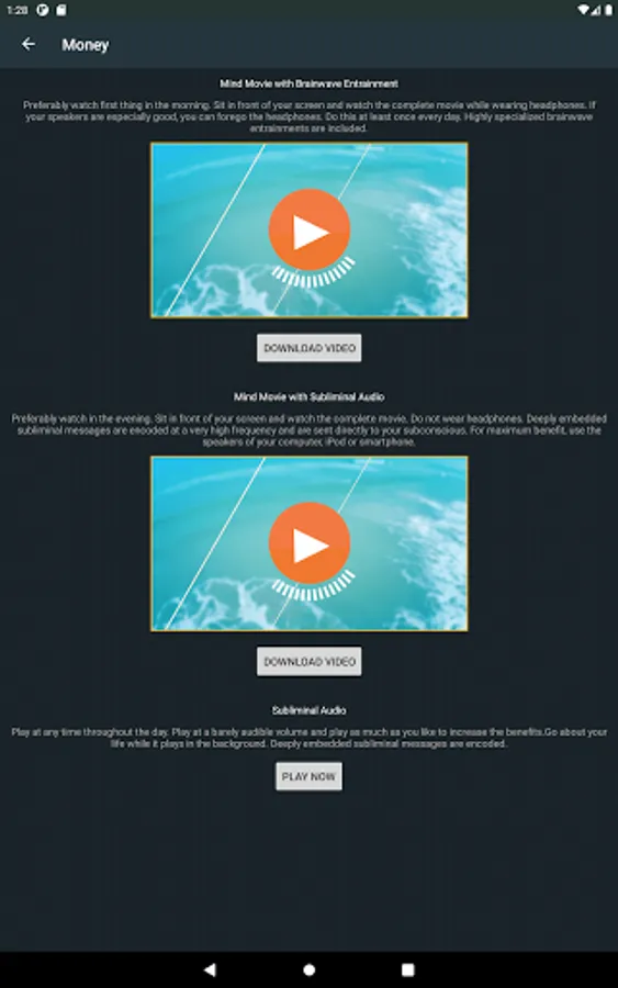 You can watch all of your Movies on your Android devices. We recommend focusing on one topic at a time. Watch your brain entrainment Movie on the topic you choose in the morning, and the subliminal Movie in the afternoon. Your guided sleep mediation is also available within the app. It's an exact replica of your Members Area.