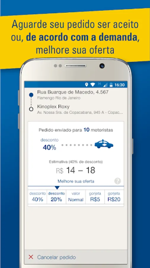 When you place an order in Rio de Janeiro or in Joinville (SC), the app immediately will track how many free taxis are close by. If there are many taxis, it will be suggested that you propose a 40% or 30%, as there are high chances of a taxi driver to accept your request.