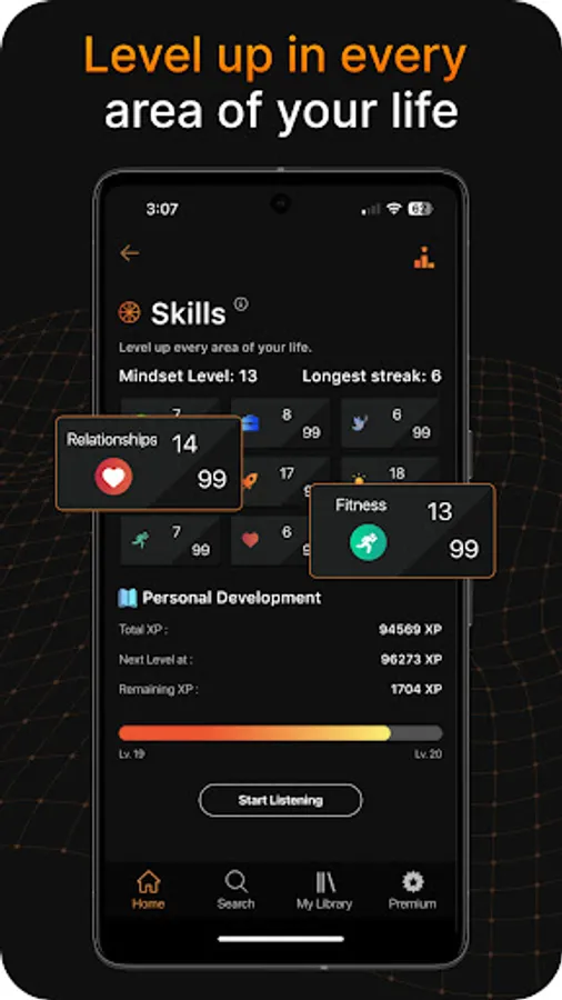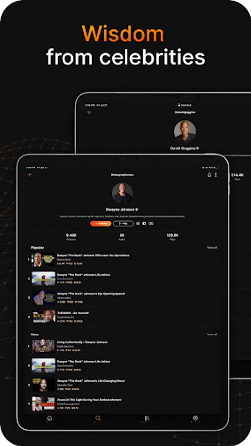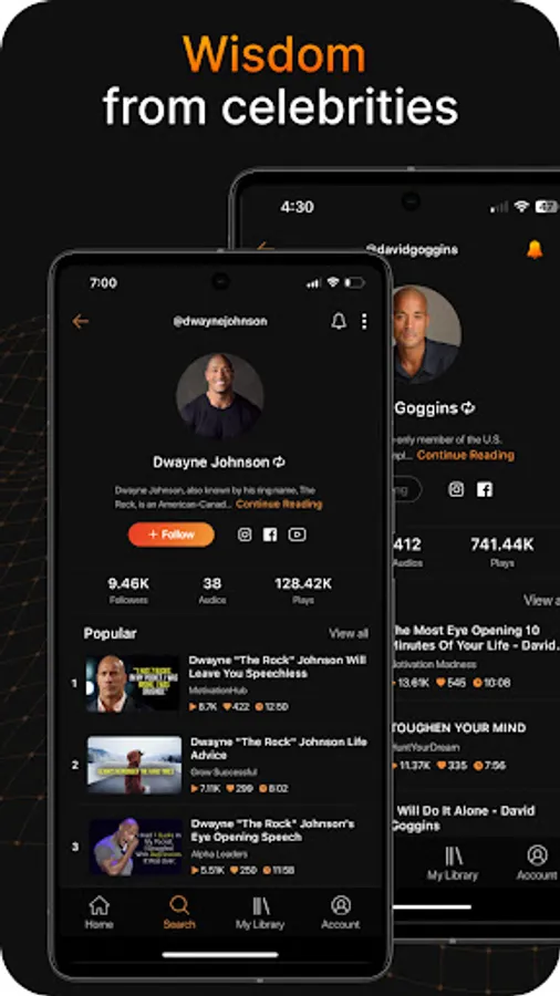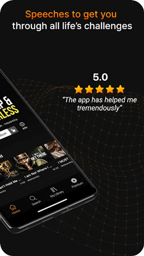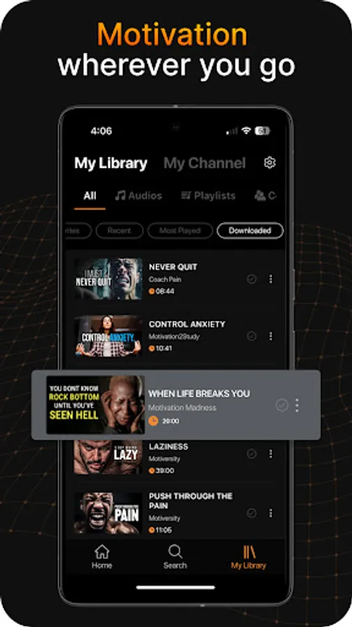 Listen to over 40 category genres - Fitness, Mental Toughness, Relaxation, Meditation, Productivity, Running, Happiness, Healthier, Energized, Wise, Disciplined, Wellness, Morning Motivation, Studying, Mental Health, Anxiety, Depression, Loss, Self Care, Mindfulness, Affirmations, Burnout, Self-confidence, Self Esteem, Resistance, Emotional Intelligence, Resistance, Brain Boost, Faith, Spirituality, Christian, Wealth, Finances, Career, Celebrity advice, Time Management, Love, Relationships, Teamwork, Goal Setting and Life Lessons.