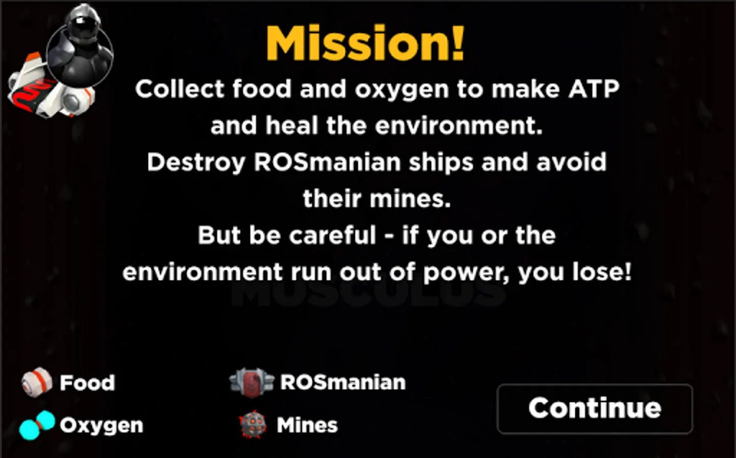 Mito Warrior is an outer space adventure game in which you must restore power to important galaxies in the human star system – Musculus, Cor and Opticus. The game is based on the critical role of mitochondria in the human body. Healthy mitochondria in our cells turn food and oxygen into ATP, while keeping in check the production of reactive oxygen species (ROS) that can damage cells and lead to disease or death. In Mito Warrior, ROS has multiplied into an army of ROSmanians that has spread across the galaxy and must be stopped! Win the game by traveling through the galaxies destroying ROSmanians and restoring power to the Mitoverse.
