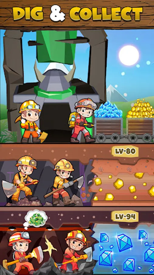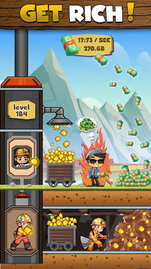 Idle Tycoon Gameplay: Experience the thrill of being an idle tycoon as your gold mine generates money, gold and diamonds even when you're offline. Sit back, relax, and watch your gold grow!