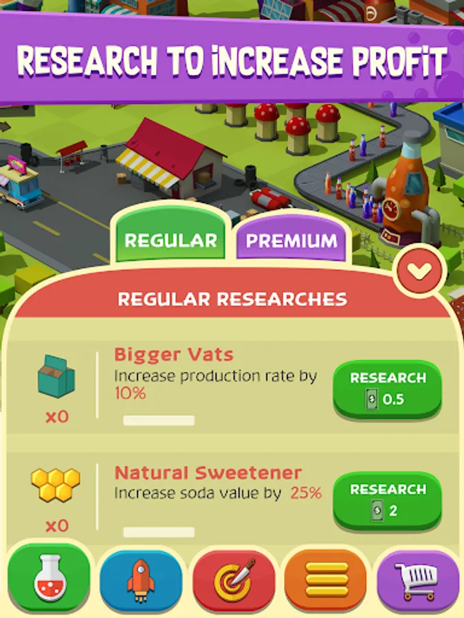 Tap fast enough to produce a cluster of idle soda types ready out for fulfil customers' need for the most demanded soda. Once the Soda are ready, delivery trucks will take away the ready soda bottles and your income will double, triple and quadruple in your idle factory. Soda tycoon is a free game, and you will surely found it the best game, because of heavy addiction.