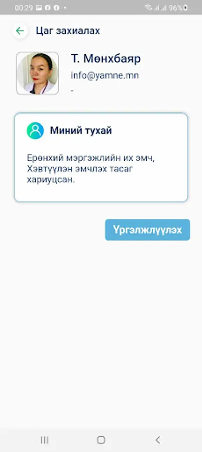 Тэргүүлэх зэрэгтэй эмч- 1, тэргүүлэх зэрэгтэй сувилагч – 1, ахлах зэрэгтэй сувилагч -2 ажилладаг. Их эмч, сувилагч нар нь Дүүргийн Нэгдсэн Эмнэлэг, Өрхийн Эрүүл Мэндийн Төв, Сумын Эрүүл Мэндийн Төв-д ажиллаж байсан туршлагатай эмнэлгийн мэргэжилтэнүүд юм.