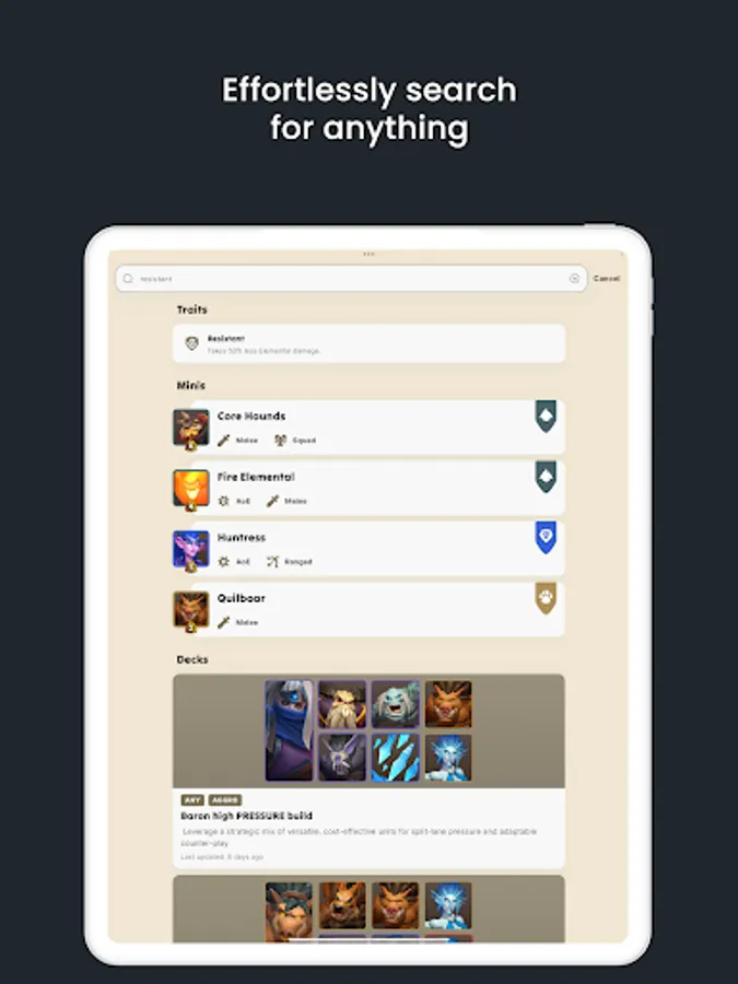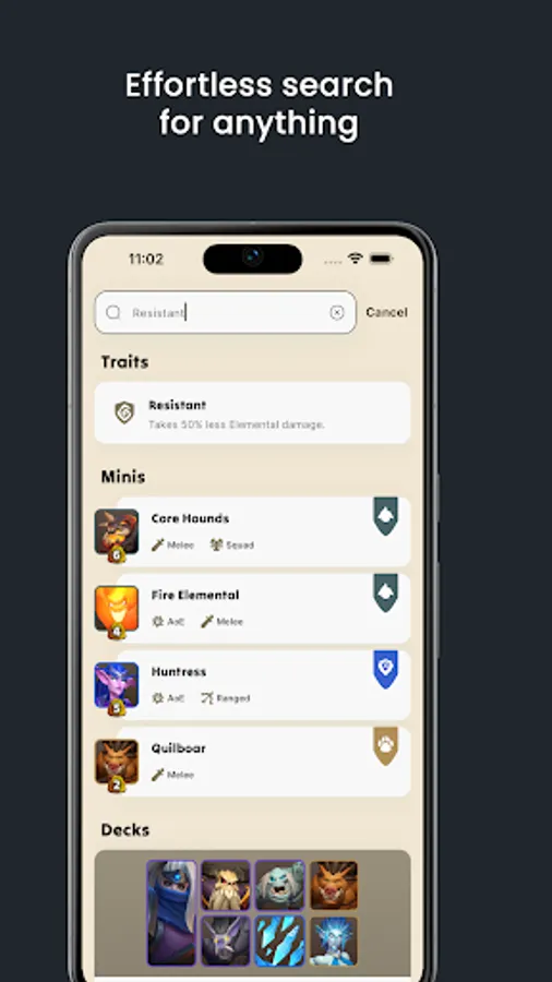 Discover which units are strong or weak against any mini, fine-tune your decks, and stay ahead of the competition.
