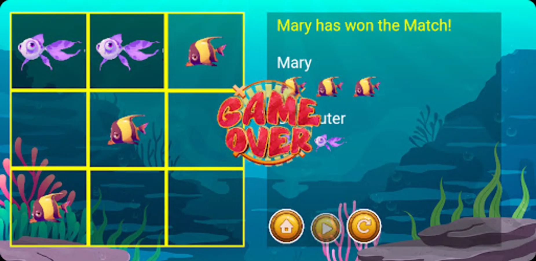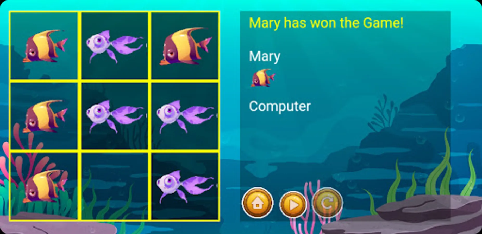 Tic-Tac-Fish is not just a game; it's an invitation to embrace the joy of friendly competition and the thrill of outmaneuvering your opponents. So gather your friends, or challenge the computer AI, and let the underwater battle begin! Dive into an oceanic adventure filled with laughter, excitement, and the unforgettable charm of fish-themed Tic Tac Toe.