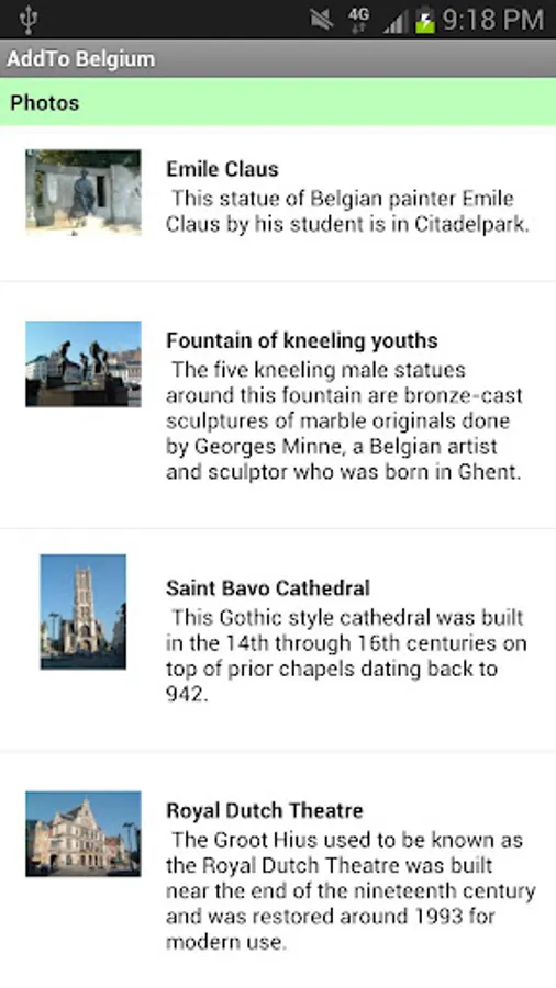 Description AddTo Belgium shows you favorite Belgium locations in Bruges, Ghent and Brussels. See the Belfrey of Bruges, Saint Bavo Cathedral, the Royal Dutch Theater, the Groenerei Canal, the Grand Place of Brussels, Gravensteen Castle, La Place du Petit Sablon, Saint-Baafsplein, Saint Nicholas Church, the 1958 World Fair clock embedded into an arch, canals in Ghent and Graslei. See impressive statues like one of Emile Claus, the Fountain of Kneeling Youths, the Van Eyck monument and Ave Maria. AddTo Belgium lets you create your own map, photo album and travel diary.