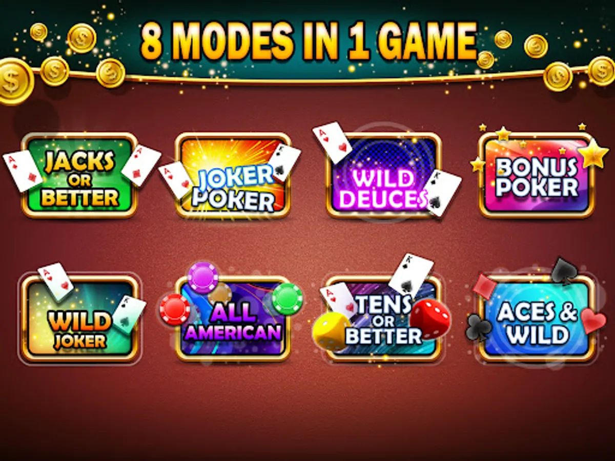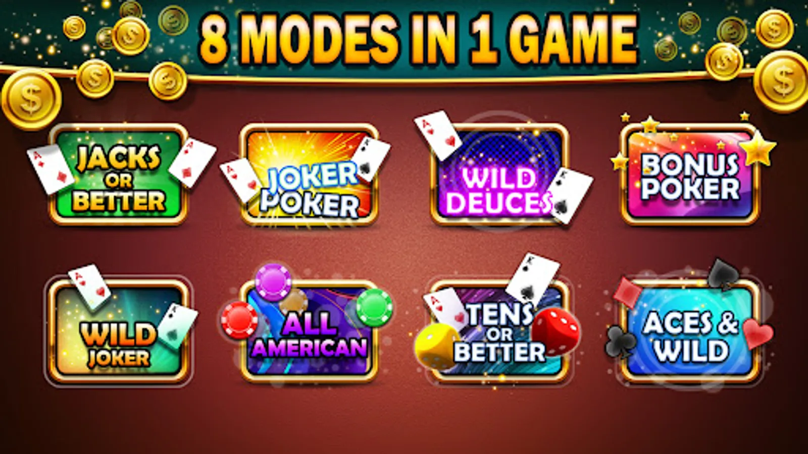 * Multiple game modes: Choose from 8 different video poker games to play.