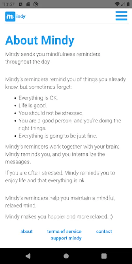 Mindy is a free service that sends you relaxing mindful reminders that everything is going to be ok. Get personalized, science-based messages that break negative thoughts and help you stay mindful, positive, and stress-free.