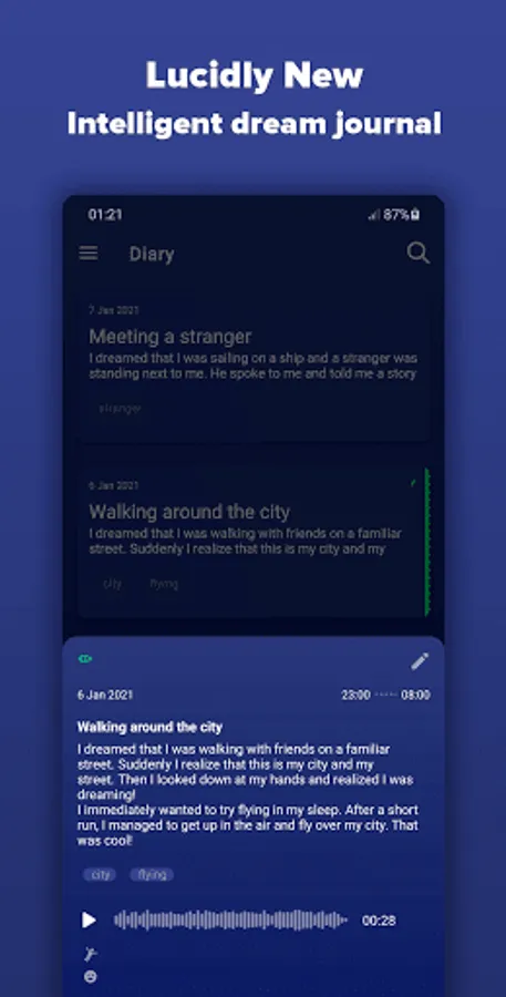Lucidly is a dream diary app that will teach you how to lucid dream, analyze your dreams with statistics, receive personalized advices for better sleep, and will make your dreams more vivid.