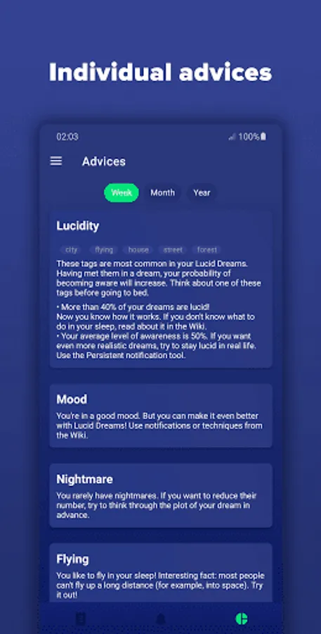 • Personal advice based on dreams statistics to make your dreams more lucid and vivid, help to choose better techniques, and much more.
