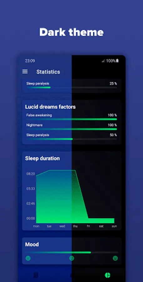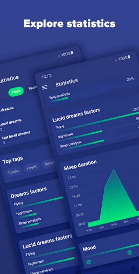• Statistics - analyse of your dreams based on information such as mood, tags, lucidity level, count of words in your dreams, sleep time and factors like nightmares, Lucid dreaming and flying.