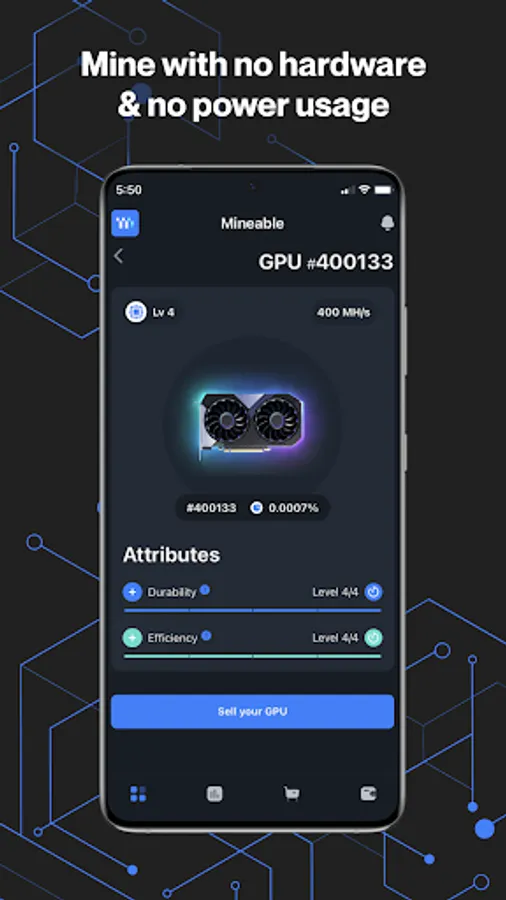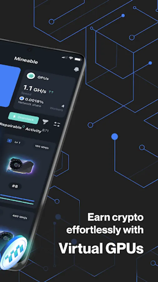 • Buy virtual GPUs to mine with from the comfort of your phone