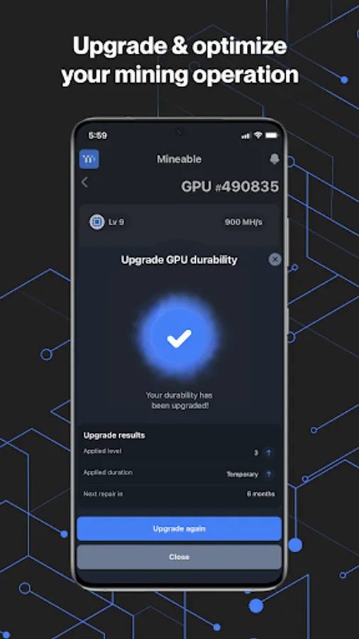 Upgrade and optimize - Your virtual GPUs are upgradable. Durability upgrades reduce the frequency in which GPUs need repairing and efficiency upgrades reduce your power costs. You can also overclock your entire operation by staking $MNB.